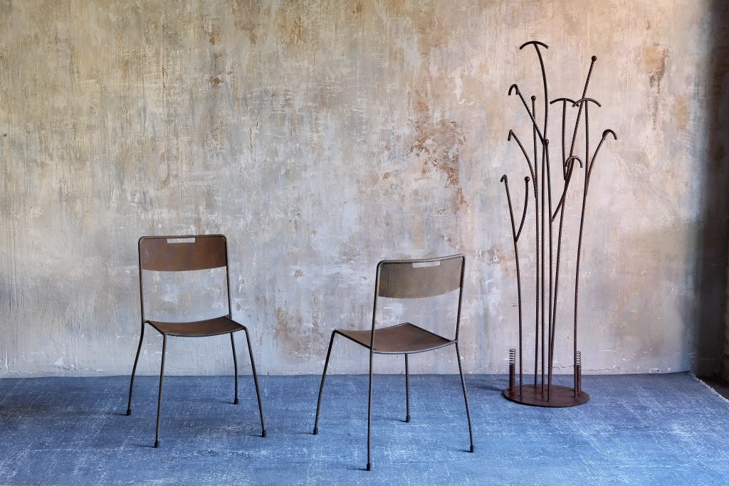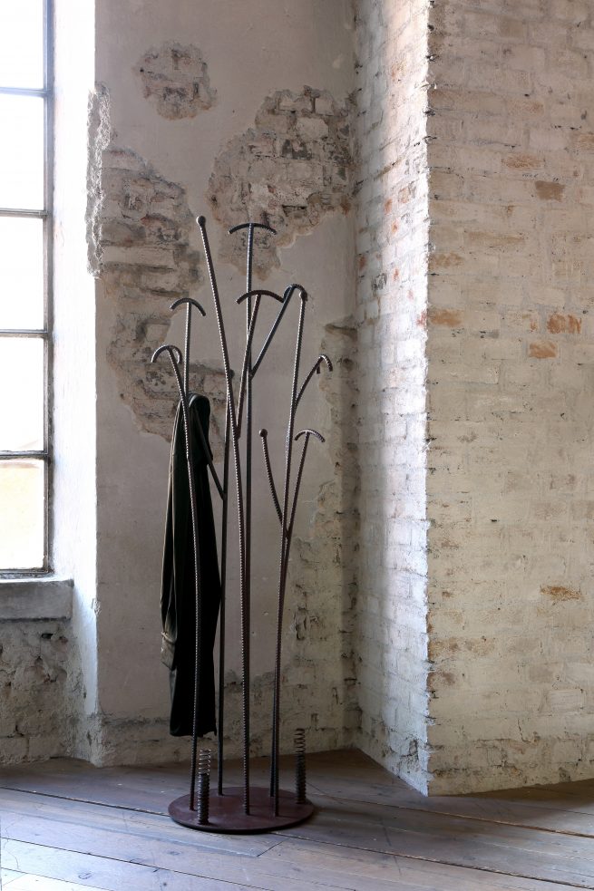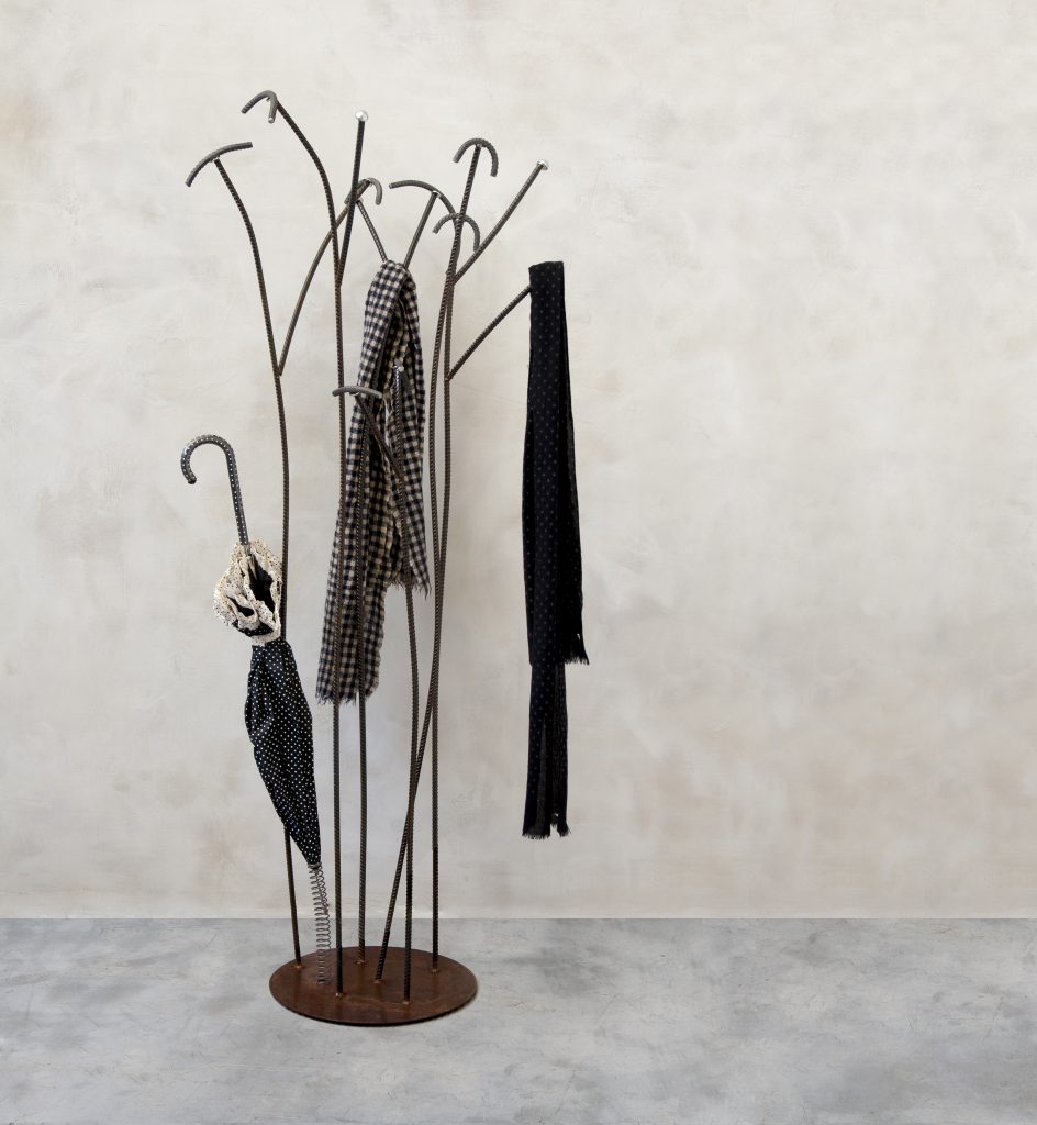 Zeus Irony Tree Valet Stand - design by Peregalli – Jiratkaruen // Elegant, minimal contemporary design. Frame with Ø 40 cm sheet steel base, 10 mm thick. Vertical elements in Ø 12 mm ribbed steel rod. Steel springs. Natural rust finish, glossy transparent epoxy painted.